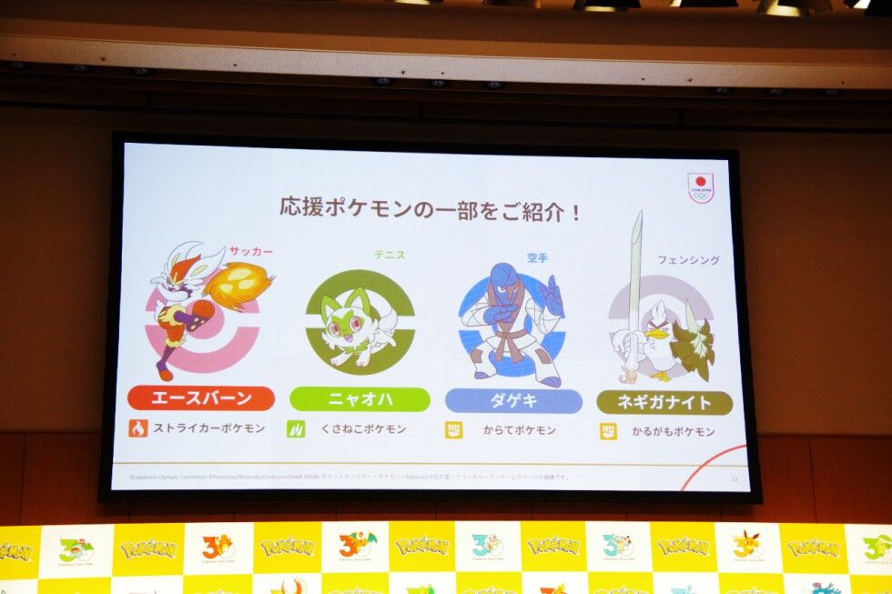 JOCとのコラボでは、「JOCキッズスポーツアンバサダー」として、さまざまなスポーツ競技に応援ポケモンが就任する。発表会では、サッカーがエースバーン、テニスがニャオハ、空手がダゲキ、フェンシングがネギガナイトと、応援ポケモンの一部を紹介した。