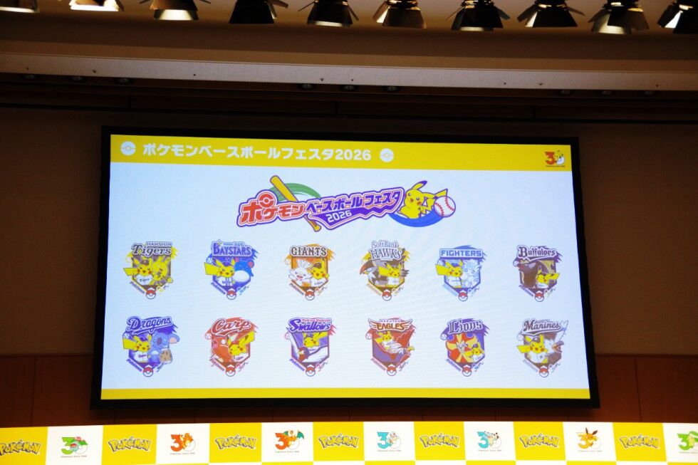 プロ野球12球団とは「ポケモンベースボールフェスタ2026」を実施。各球場でポケモン特別演出試合を開催するほか、球団のユニフォームを着たピカチュウやそれぞれの球団パートナーポケモンがデザインされたオリジナルグッズを販売する。発表会の会場には、プロ野球12球団各チームのユニフォームを着たピカチュウが駆けつけた。