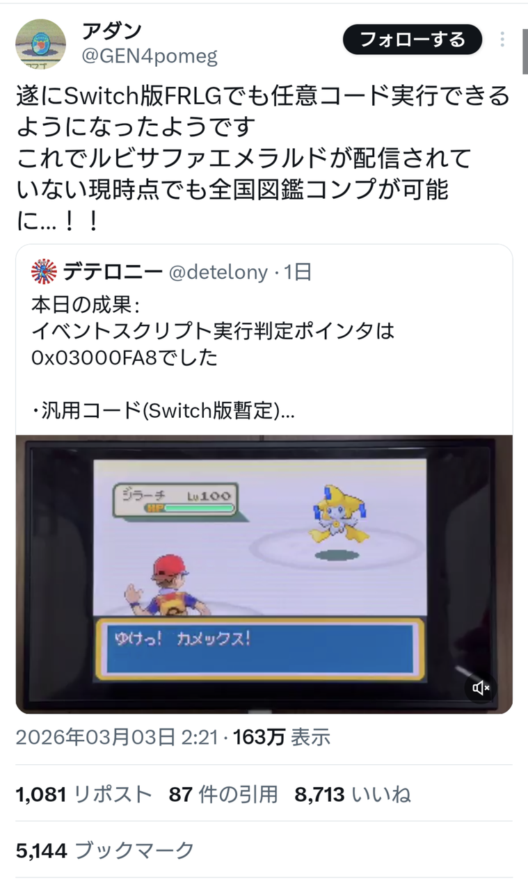 ポケモンFRLG、任意コード実行によってポケモンhomeにバグポケモンを送れる異常事態に